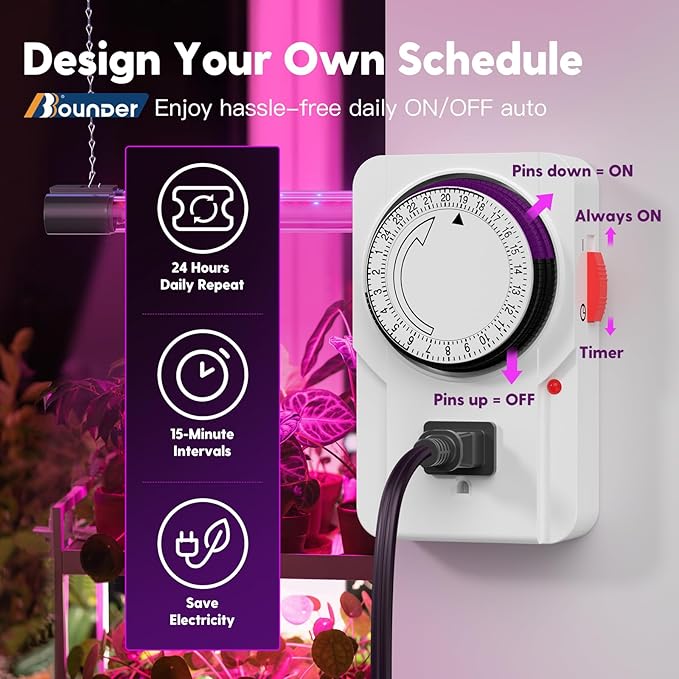 - 24H Timing Function: Our LED grow light, equipped with a mechanical outlet timer, ensures your plants get the exact light they need, even when you're not around. Set your lighting schedule once, and enjoy up to 24 on/off settings and 15-minute interval precision. Once programmed and plugged in, your plants will be automatically cared for daily, freeing you from manual switches