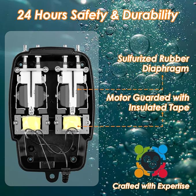- ULTRA QUIET - This koi pond aerator is designed for minimal noise, featuring a straight air flow path, vibration-absorbing rubber feet, and an interior housing design with a unique texture. You can adjust the air flow using the dial at the top.