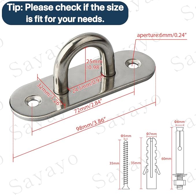 - Easy to install & Tip: The screw hooks package includes all the accessories and installation instructions you need. 6 x oval eye pad + 12 x expansion bolts (0.31’’Dia, 2.36’’L) + 12 screws + 12 plastic anchors. Tip: Make sure the pad eye plate hooks are the right size for your needs.