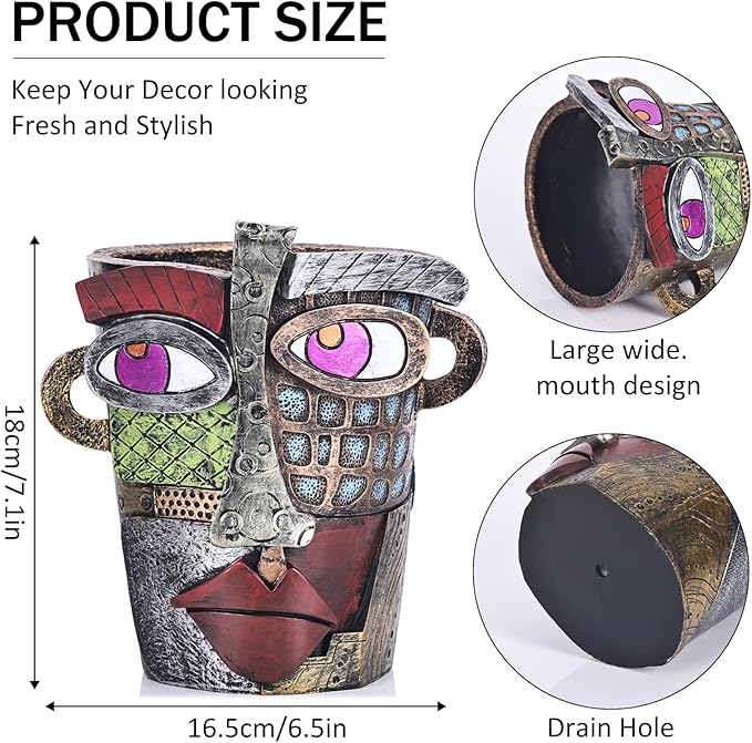 - Abstract and Unique Design: This funky plant pot is made from high-quality resin, featuring an abstract and colorful face design that is sure to catch the eye. Its unique appearance makes it a standout piece among face planters and head planters, perfect for those who love eclectic flower arrangements and vibrant decor. The design brings a playful and artistic touch to any setting, whether indoor or outdoor.