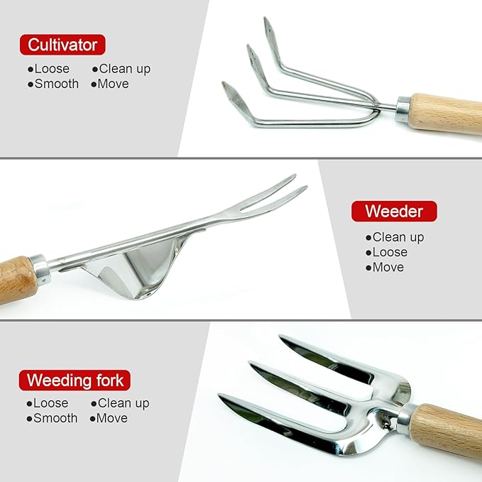 - 【Ergonomic Handle Tools】 Each tool has a comfortable, ergonomically designed anti slip handle that is suitable for different hand sizes, ensuring safe grip and reducing wrist and hand fatigue during prolonged use. Their thoughtful design can provide sufficient leverage and save energy and stress during planting, weeding, and excavation, allowing you to easily handle various gardening tasks