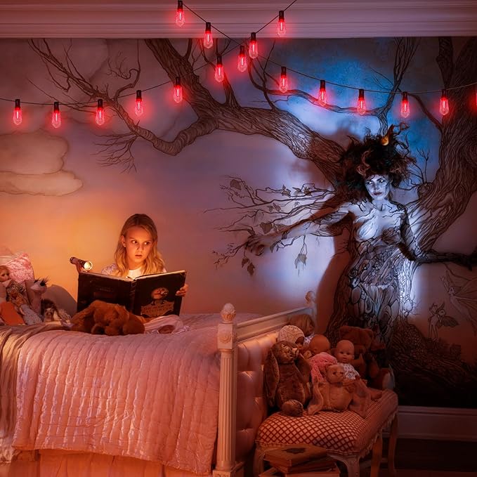 - Halloween Lights :10 feet of outdoor Halloween decorative lights with 10 hanging sockets and flashing flame bloody bulb (1 spare bulb), C9 or E17 middle screw base, 1W C9 Halloween flashing flame bulb. Halloween decorative lights emit warm, bright red light, like a flame, creating a scary Halloween effect and spooky atmosphere.
