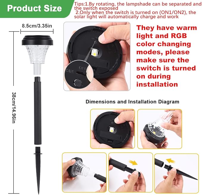 - [2 Mode Outdoor Solar Decorative Light] The solar path lights outdoor can be switched between color changing mode or warm light mode through a switch, which can decorate your patio, garden, or any sunny place, adding a wonderful atmosphere to your yard