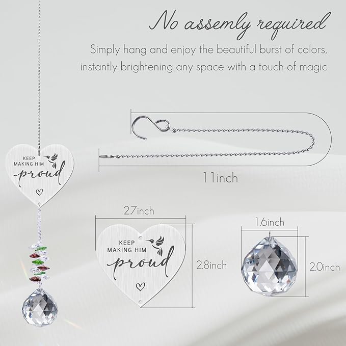 - Memorial hanging crystal suncatcher words read "Keep Making Him Proud," ,serving as a reminder of the enduring love and connection with a lost loved one. Telling those they left behind to live well and keep making him proud.