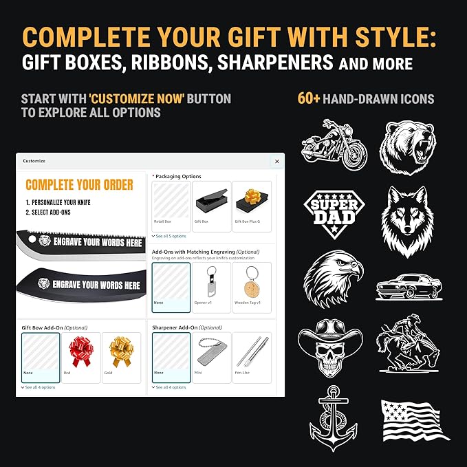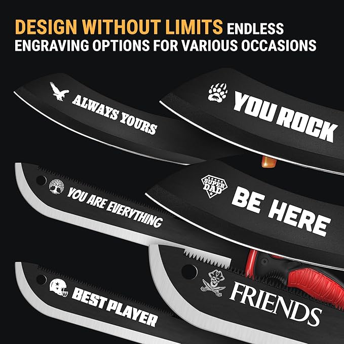 - Customizable Blade Options: Choose from a serrated edge for tough cutting tasks or a parang shape for precise slicing, perfect for every outdoor challenge. Personalize with our high-quality laser engraving, using stylish fonts and over 50 icons, for a unique design. Choose your customization with our additional options