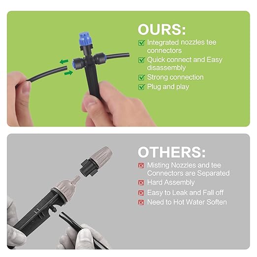 - Firmly connection and Water-tight : Integrated sprinkler nozzles tee connectors , This quick connector with a buckle connection point that can tightly connect the tube,preventing fall off and leak.You cut the 1/4 line and simply insert each end into a connector. You can hear it click.It can provide a water-tight fit and high water pressure to cover your flower bed.save your water bill.