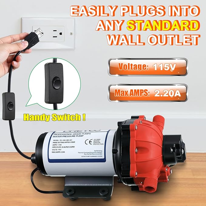 - Water Diaphragm Pressure Pump: with a maximum flow rate of 5.5 GPM and the ability to self priming up to 10 feet, this 115V water diaphragm pump is a true powerhouse for your water needs; This self priming sprayer pump easily plugs into any standard wall outlet in your home, making it an excellent water pressure booster pump for home