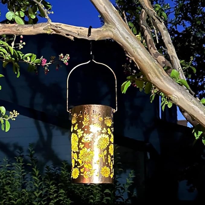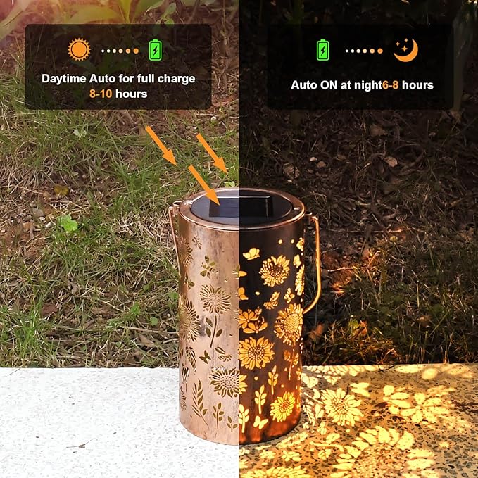 - Beautiful Design: This hanging solar lantern sunflower light features a warm white LED lens design and with vintage hollow design, warm lighting vivid sunflower pattern will cast beautiful patterns on the wall or ground, bringing life and fun to your garden, and also a creative light for garden patio and decking. SIZE: 7.1 "H x 3.9 "W x 3.9 "L
