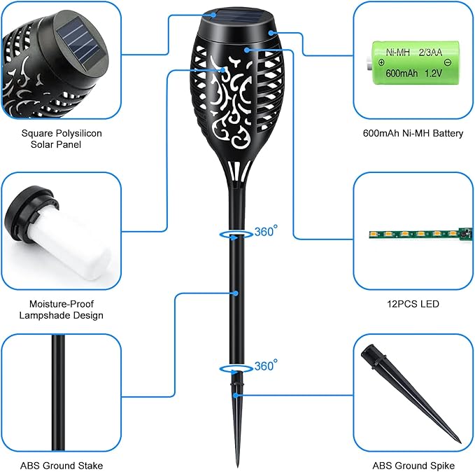 - Solar Powered Lights: Each Solar Torch Lights with 12 LED, equipped with 600mAh high capacity rechargeable battery, automatically charge for 6-8 hours during the day, and automatically start lighting for 8-10 hours at night. (Note: The duration is affected by weather and light, it is recommended to install in a place with sufficient light)