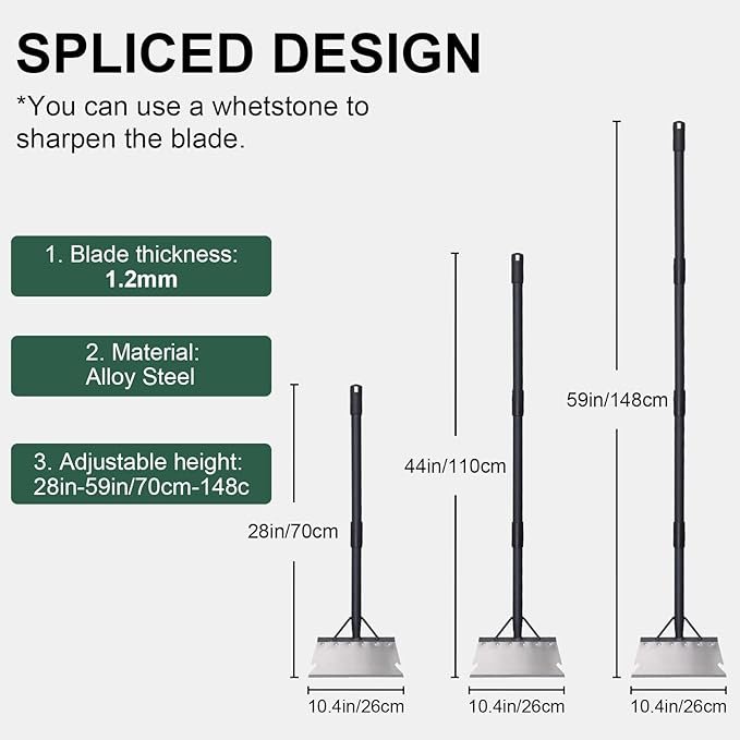 - Sturdy and Durable Design: Crafted from high-quality alloy, both the cleaning shovel head and handle are sturdy and built to last. The thickened shovel head ensures effortless weed removal and ice scraping without the blade rolling. Additionally, the alloy handle offers exceptional durability compared to traditional wooden handles, making it ideal for heavy-duty use.