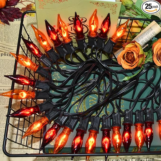 - 🔥【UL Certified, IP44 Waterproof】: This Orange and Purple C7 Flame Flicker String Light is UL listed with an IP44 waterproof rating for safety and durability, and the flames protect against spills and dust, ensuring that it meets the needs of both indoor and outdoor Halloween decorations. The flickering flame lights will add color to your Halloween event.