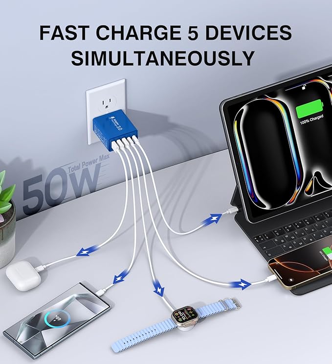 USB C Wall Charger, 50W USB C Charger Block 2-Pack 5-Port PD Fast Charging Blocks,Multiport 2USB C+3USB A Plug,Type C Power Adapter Brick Cube for iPhone 16/15/14/13,Samsung,for Switch(Dark Blue)