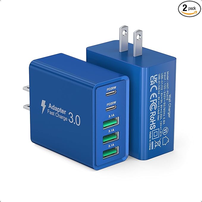 - 2-Pack USB C Charger Block:Multiport wall charger has 2 USB-C ports and 3 USB-A ports.It can charge multiple devices at the same time, including cell phones, tablets, mobile power and headphones and game consoles, etc., and it minimizes waiting time. It minimizes waiting time and saves you a lot of space, making your desktop more tidy