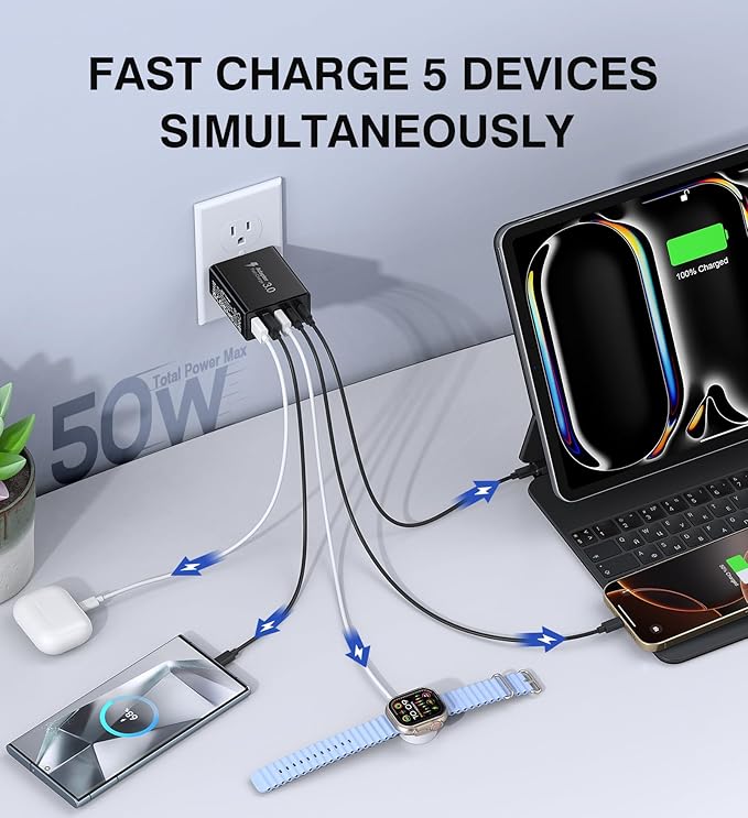 - Safe and Reliable USB C Plug:The 50W USB fast charger station has a built-in smart chip with GaN technology that automatically matches the current required by your device, preventing it from short-circuiting, over-current, over-voltage, overheating and over-charging. Meanwhile, the USB charger block is made of ABS + PC fire-resistant material, ensuring that your digital devices are always safely charged 24 hours a day