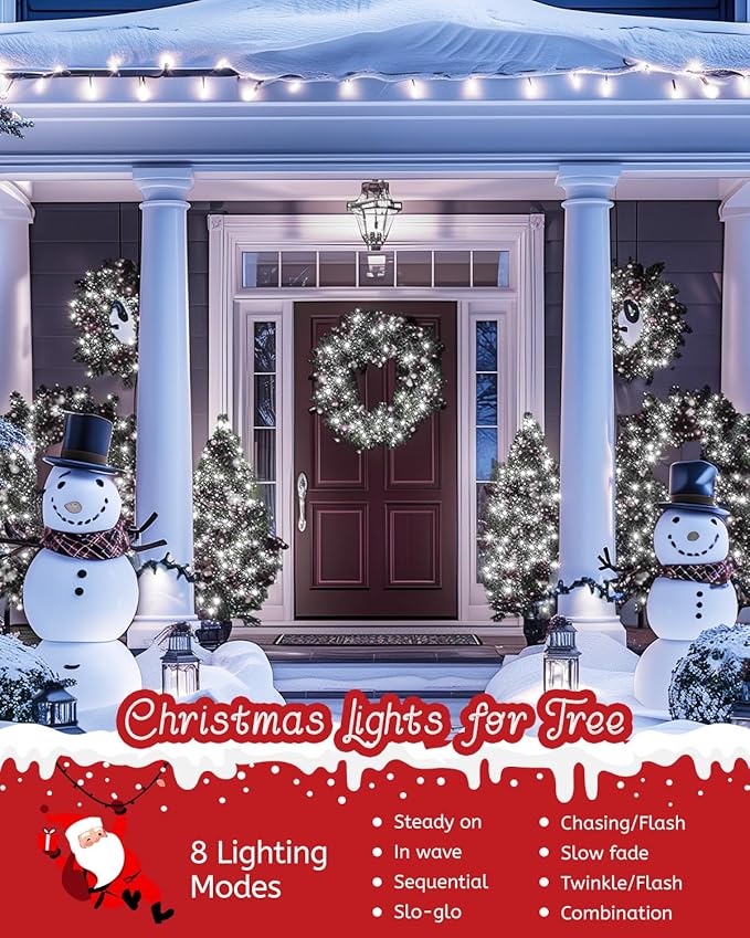 - 8 Lighting Modes: These led Christmas lights are waterproof, feature 8 lighting modes, including Combination, In waves, Sequential, Slow Glow, Chasing/Flash, Slow fade, Twinkle/Flash and Steady on. Just press the round button on the adapter to set up your mode to fit your Christmas/special holidays party decor. Popular cool white Christmas-color led string lights, light up a uniquely outdoor/indoor illuminated backdrop for your vivid and funny decorations