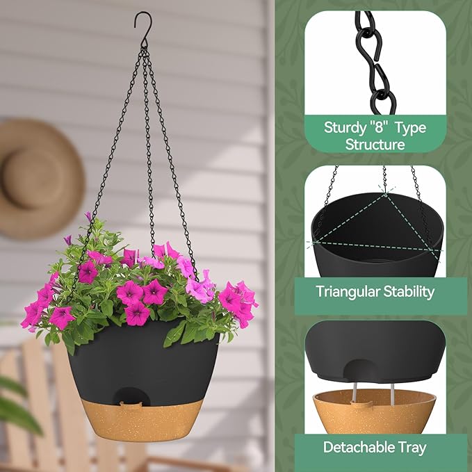 - Sturdy and Durable Material: The plastic flower hanging pots are made of high quality recyclable PP material, light weight, non-toxic and odourless, protects plants and soil. Super strong load-bearing triangular chains, increasing the stability of the hanging plant holder, so the hanging planter for indoor plants can easily hang plants weighing up to 20 pounds without taking up any floor space