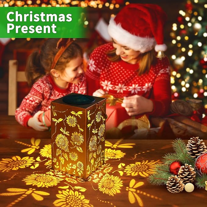 - Excellent Gift Options: This outdoor solar lantern dragonfly dances around the sunflower, and the light is projected on the table or the ground,making your terrace stand out. The lantern is perfect for indoor, backyard, path, sidewalk, patio and home decoration. It is a gift for Mother's Day, Father's Day, Thanksgiving, Valentine's Day,gardening,Christmas,Halloween, wedding, and a birthday gifts for women.