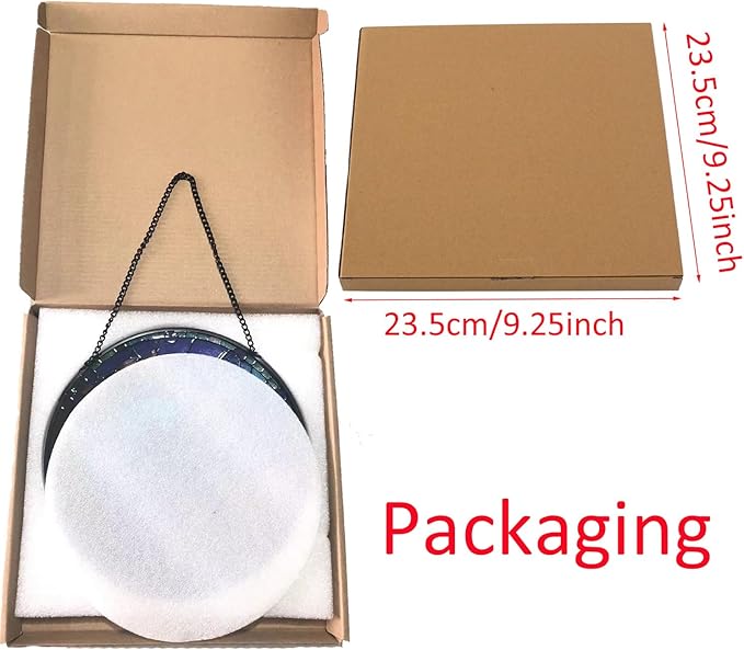 - 【Product Size】Stained glass hanging size is 20*20cm/7.87*7.87inch,equipped a chain,the size is 34cm/13.4inch. You can hang it anywhere you want, balcony, window or courtyard. Stained glass decor capture sunlight and add vitality and color to your home.