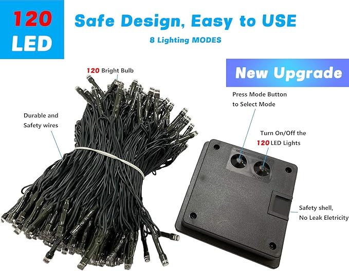 - Christmas lights outdoor: 2024 New Upgraded Solar Christmas Lights,Each pack of cool white Christmas lights is 47.5 feet long, the lead is 6.6 feet long, and the bulb spacing is 0.34 inchesBased on the old 100LED, our Christmas decorations lights have added 20LED and lead length, which makes us more free to arrange the scene. Outdoor led lights suitable for decorating your Garden, Patio, Yard, Christmas trees, Stage, Fence, Hotel, Outside Porch, Etc