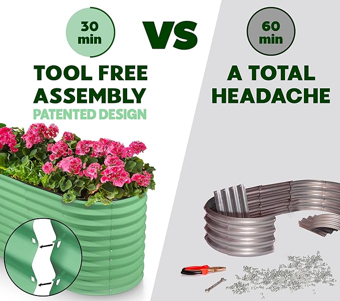 - EFFORTLESS ASSEMBLY, LIKE NO OTHER! Begin your planting journey by choosing our innovative patented design, featuring the perfect combination of easy assembly and durability. Thanks to our unique tool-free design, assembly is a breeze and can be completed in just 30 minutes! Get started on your garden right away and enjoy fresh, healthy produce in no time.