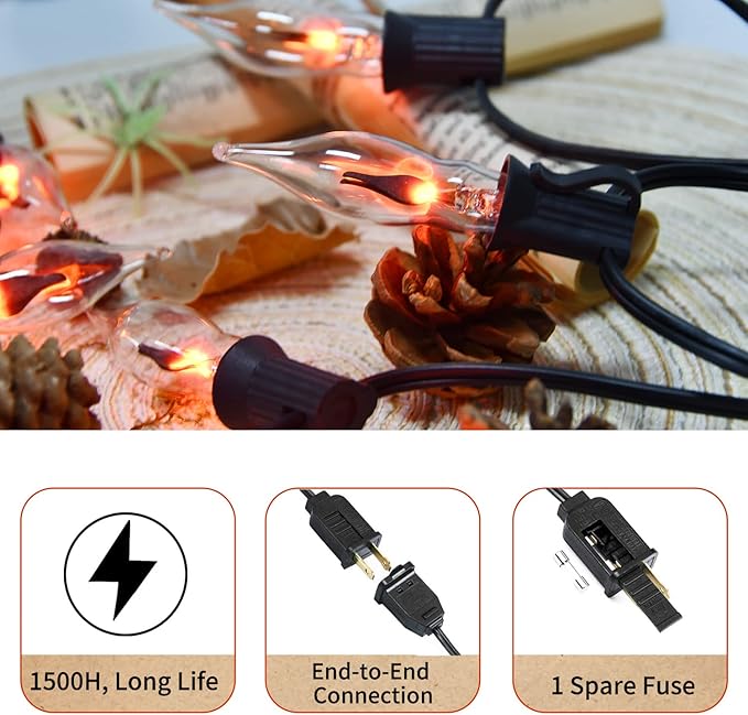 - 🔥【Clear Flame Lights Specifications】: This unique fake flame Christmas light string is 12.8 feet in total length with 39.5 inches / 1 meter male plug leads, 12 inches spacing between bulbs, and 6 inches female plug leads. Each string of flame lights has a total of 10 clear glass flame bulbs and 2 spare C18 clear flame bulbs, 1 watt, 120 volts. Flashing Christmas lights provide 2000+ hours of illumination and are safe and durable, eliminating the need for frequent bulb changes.