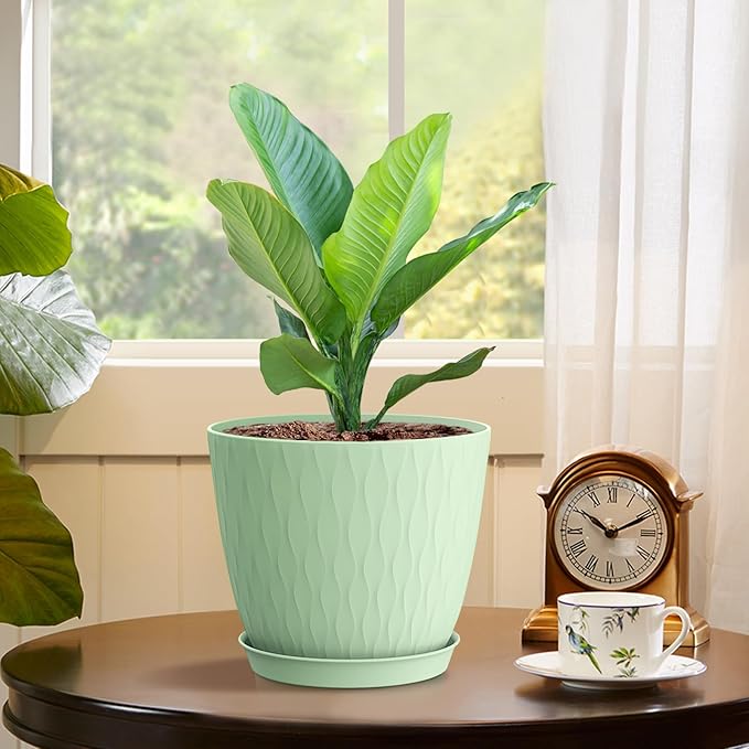 6 inch Plant Pots, 5 Pack Flower Pots with Drainage Holes and Saucers for Indoor Plants, Plastic Planters with Water Ripple for Small Garden House Plants, Nursery Pots for Succulent, Green