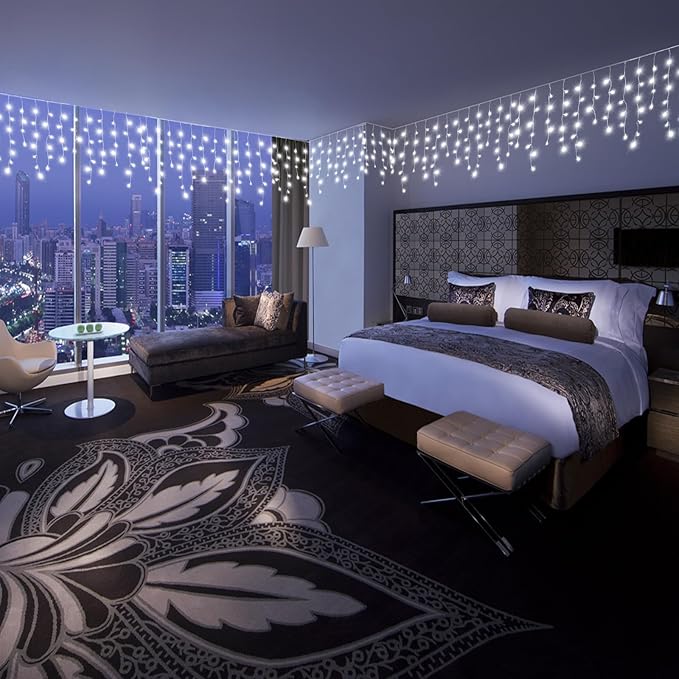 - Timer Function - Long press the button on the adaptor for 3 seconds to activate the timer, 6 hours turn on and 18 hours off, freeing up your hands. These icicle lights indoor can be easily draped or hung on the outdoor roofs, yards, window, patio, garden, fence or indoor bedroom, creating a dreamy and romantic atmosphere.