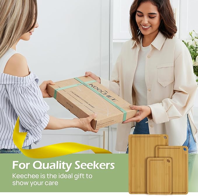 - ๐๐๐ง๐๐๐ข๐ญ ๐๐ฎ๐ซ ๐๐จ๐ฆ๐ - Keechee's cutting board set is crafted from sustainably harvested quality bamboo forests(Bamboo grows quickly and a single bamboo can be harvested multiple times). Known for its natural strength and eco-friendliness, our bamboo provides a durable and environmentally responsible choice for your kitchen.
