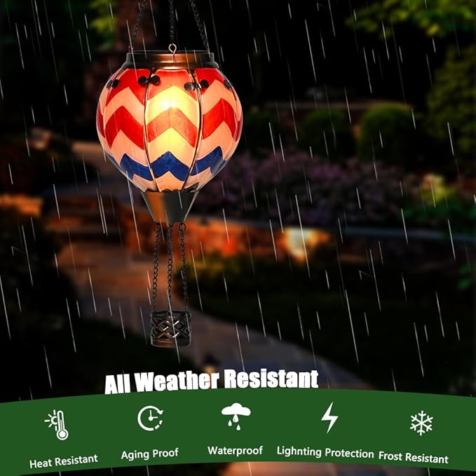 - Weather Resistant》》》 Bathtoo solar balloon lanterns outdoor hanging equipped with IP 66 solar panel, made of high qualty glass and rust-resistant coated metal. Our hot air balloon solar lantern with flickering flame light will adapt to all weather