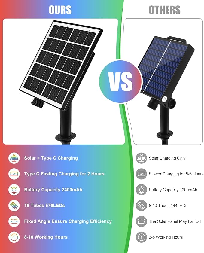 - Energy-Saving & High Efficiency: The meteor shower lights are powered by solar energy, eliminating the need for additional utility costs and battery replacements. With a full charge achieved under 6-8 hours of direct sunlight, the single color solar meteor lights can provide illumination for up to 16-20 hours at night, and multi-color solar meteor lights can work up to 8-10 hours