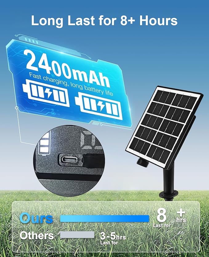 - Easy Operation: The solar panel collects sunlight throughout the day, automatically activating the solar lights at dusk and deactivating them at dawn, ensuring easy operation and energy efficiency. feature a rechargeable 1XAA 1.2V 2400mAh Ni-MH battery, it can be charged with type C cable in rainy and cloudy days