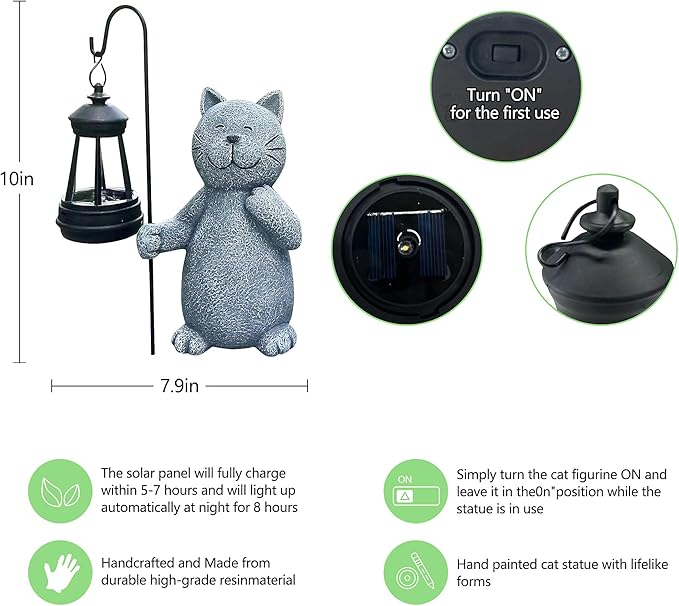 - 【 Exquisite Design 】 This smiling cat is holding a solar lantern in its right hand and chin in its left hand. Its fingers are lifelike and its beard is visible, making it extremely cute. Suitable for various indoor or outdoor scenes. The size of this solar powered cat resin statue is 5X5X10 inches.