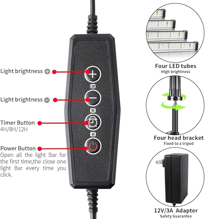 - 【Easy to Install】 you can easily put the 4-head lamp into the bracket and turn the screw to fix it. Then adjust the height according to your needs. The bracket is made of steel and aluminum, which is VERY strong and dissipates heat VERY quickly.