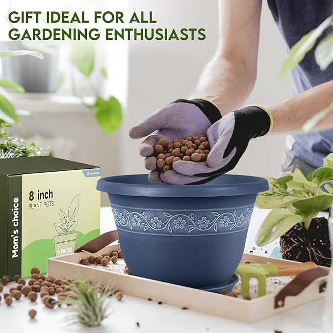 8 Inch Plant Pots with Drainage Hole - Lightweight Flower Pots for Herbs and Flowers - Home Decor Plastic Planters for Indoor Outdoor Plants- Pack of 6 (Blue, 8 inch)