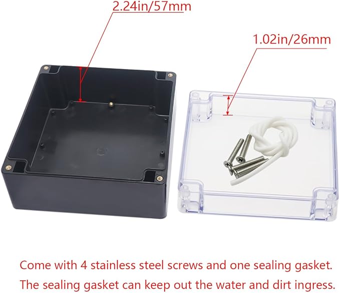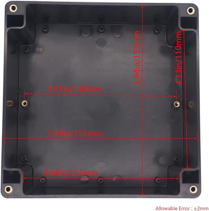 - 【Size】- Outer size of the project box: 6.3"x 6.3"x3.54"(160 x 160 x90 mm); Inner size of the project box:5.94" x5.94" x 3.27" (151 x151 x83mm)