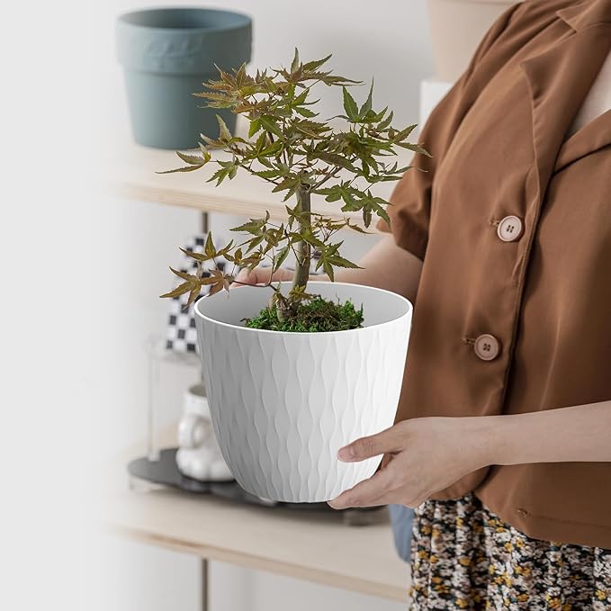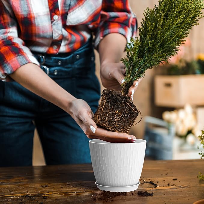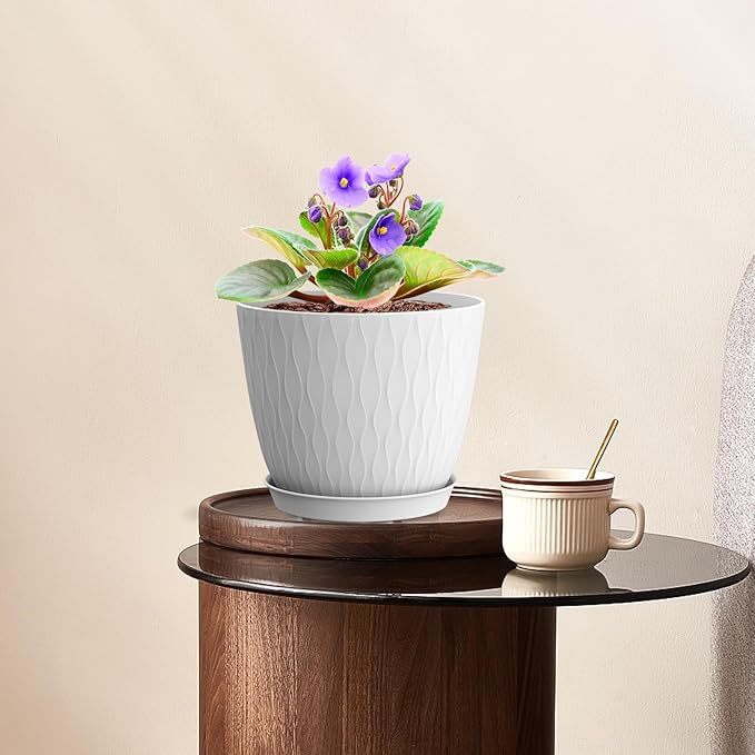 - [Sturdy PP material with Matte Finishing Exterior] There 6 inch plastic plant pots are made of 0.12inch thickness plastic. Be safety placed on the windowsill, home and office. Plastic pots are ligthweight, they tend to retain moisture, so you will water less frequently. And Easy to wash and reuse