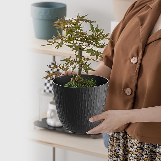 - [Sturdy PP material with Matte Finishing Exterior] There 6 inch plastic plant pots are made of 0.12inch thickness plastic. Be safety placed on the windowsill, home and office. Plastic pots are ligthweight, they tend to retain moisture, so you will water less frequently. And Easy to wash and reuse