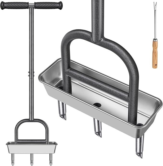 - Stainless Steel Soil Core Storage Tray: The soil storage tray of this manual grass aerating tool is made of SUS 304 stainless steel, which prevents rust and deformation. The container design allows for automatic collection of the ejected plugs, saving you time and effort in cleaning the lawn.