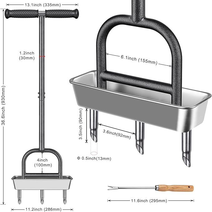 - 12’’ Weeding Tool: The lawn aerator comes with a 12’’ hand tool that can be used to clean the aerator. It is also useful for transplanting seedlings and weeding, making it very convenient.