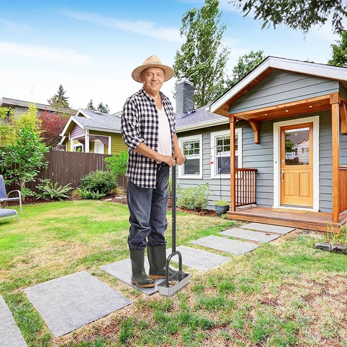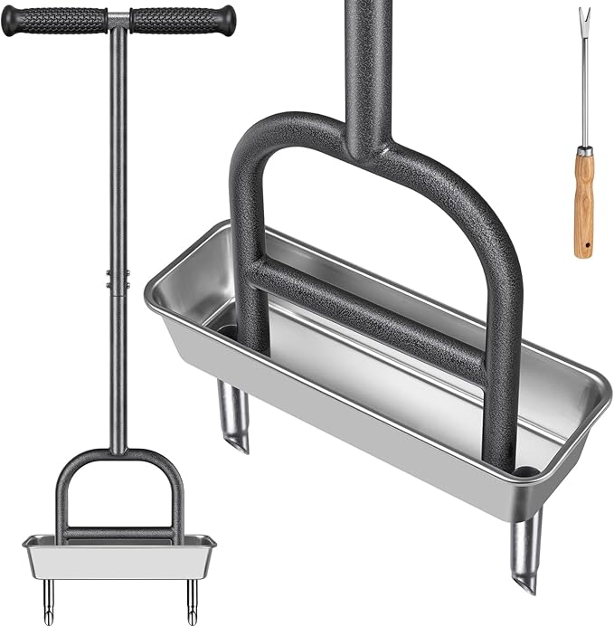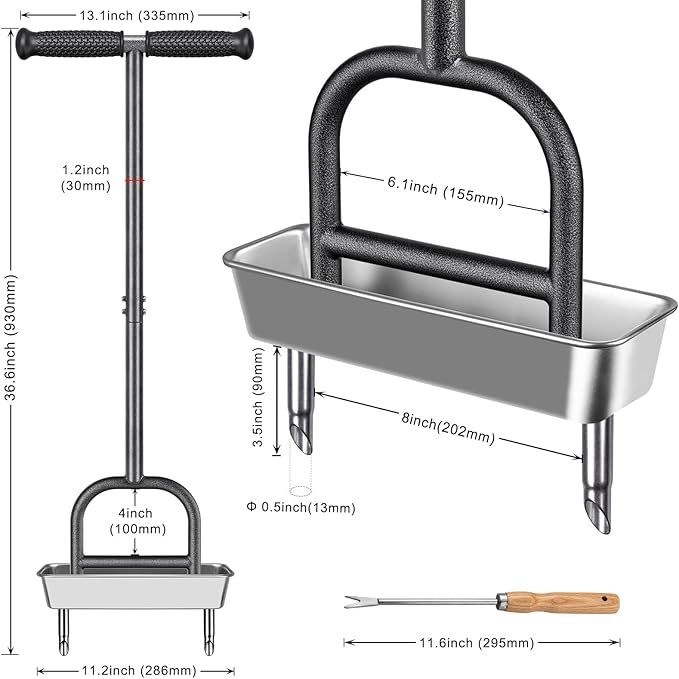 - Stainless Steel Soil Core Storage Tray: The soil storage tray of this manual grass aerating tool is made of SUS 304 stainless steel, which prevents rust and deformation. The container design allows for automatic collection of the ejected plugs, saving you time and effort in cleaning the lawn.