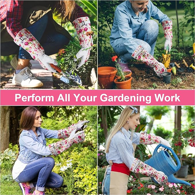 - Full Protection Long Gardening Gloves Women:Our garden gloves are carefully double thread sewn, with soft palm and reinforced fingertip provide additional wear-resistant protection. The elastic wrists that can be fixed the long gardening gloves, preventing them from slipping and providing a perfect fit. The extended adjustable cuffs protect the forearm from cuts and scratches.