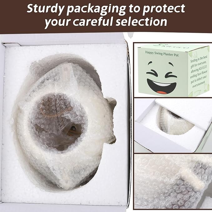 - 【2024 New Upgrade, Larger Capacity Design】: KIUGCO Swinging Smiley Face Planter adopts thickened hemp rope and thickened outer wall to provide sturdy load-bearing capacity and weather resistance. At the same time, we have increased the capacity of the planter to meet the needs of buyers to plant larger succulents. Its unique swing shape, coupled with its oversized smiley face, creates a whimsical sense of humor, adding a touch of fun and charm to your room and garden.