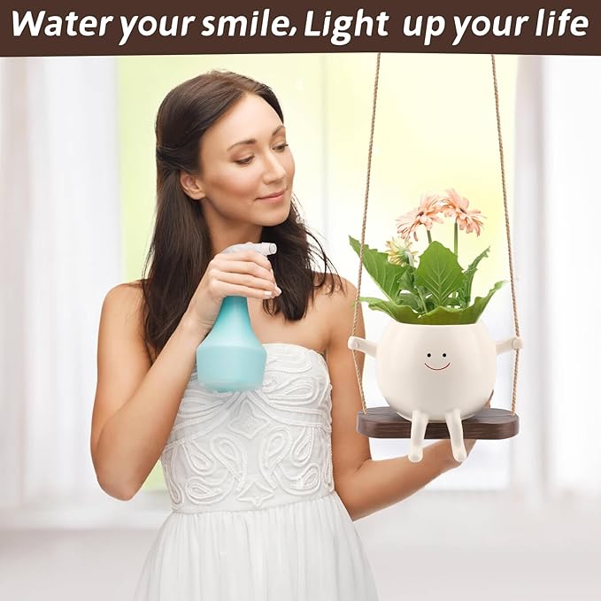 - 【DIY Design】: KIUGCO Hanging flower pot looks like a carefree little person sitting on a swing. Perhaps it wants to cover up its baldness with a polite smile. So please unleash your creativity to help it, plant your favorite succulent plant as its fluttering hair, and bring a fluttering green color to your garden or room.