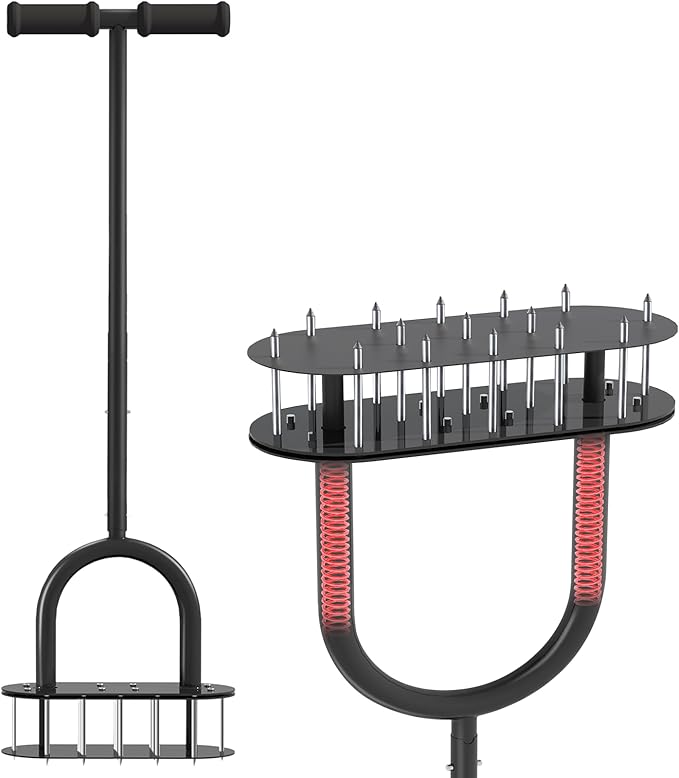 - Ergonomically designed for ease of use: the padded T-handle provides a comfortable, non-slip grip. The footplate is 1.6 inches wide and 0.8 inches thick to easily support your full weight, maximising downward force and keeping your body balanced and safe.The 36-inch patio aerator makes it easy to inflate without back pain.TIPS: If your soil is hard and dry, please water your lawn first so that the yard aerator tool can work best.