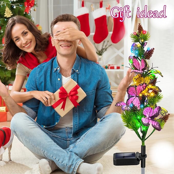 - 【Unique Design】Solar Garden Lights fixture stands out for its artistic design, mimicking elegant butterflies perched on pine trees, adding interest and charm to outdoor decor. Colored LED lights combined with the attractive contours of butterfly trees complete it. It's a very attractive Christmas decoration,outdoor solar lights for trees,christmas yard decorations,outside christmas decorations for yard,solar christmas tree.