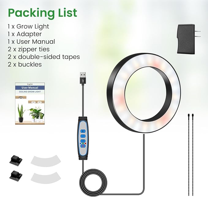 - Space saving and Wide Irradiation: With 5V 3A adapter, 6.3 inch diameter halo plant light provides ample coverage for your indoor garden. this grow light also stylish decoration for any home space. Suitable for all types of locations such as hangings, floor planters and more.