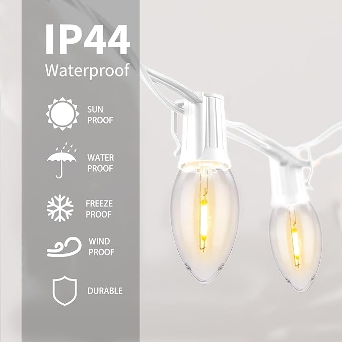 - Energy Saving and Connectable: 1W per C9 bulb, more energy saving campared with traditional glass incandescent bulbs, LED light energy efficiency up to 99%, dimmable brightness and service life up to 25000 hours; End to end connectable up to 13 strands, flexible to arrange your decoration and long enough to cover your outdoor and commercial decor area