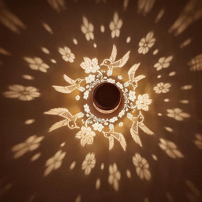 - Graceful Decorative Design - The retro appearance, with gold copper color and hollow out metal veneer, the solar outdoor lanterns casts bright and warm light in darkness, accompanied by gorgeous and graceful hummingbirds patterns, adding a beautiful atmosphere to the surrounding environment.