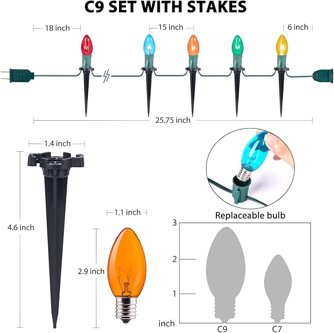 - 4 Pack 20 Multicolor C9 Pathway String Lights: Traditional 25.7 Feet 20 Clear lights strands with 15 inches spacing, 20 Stakes, 3.9 inches anchor spike, E17 holder compatible, plug in and enjoy it. It is also an exquisite gift for friends, families or relatives too