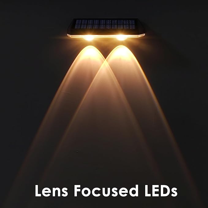 - 【Focused Beads & Unique Lighting Effects】Each solar light is equipped with 2 LEDs that are amplified by convex lenses to emit a more focused and intense beam of light, illuminating a wider area. When night falls, the lights will cast a mountain-like beam of light on your fence, providing the right light effect to help create a romantic atmosphere without dazzling your eyes.